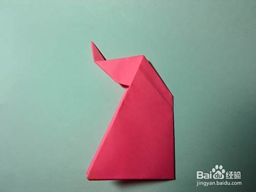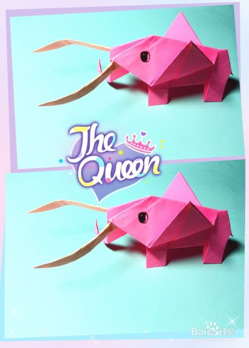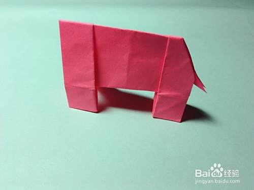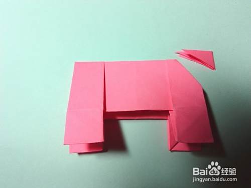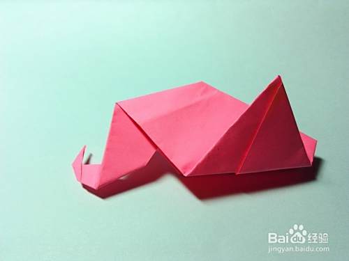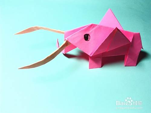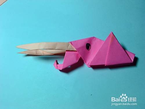 将象的尾部的角向内折,再用剪刀剪一块略长些的尖三角形,用胶棒粘到内折的夹层中,露出一点尾部。