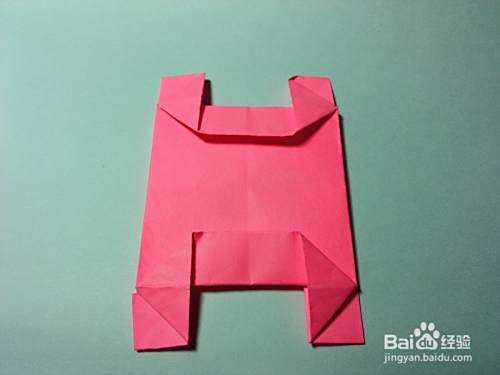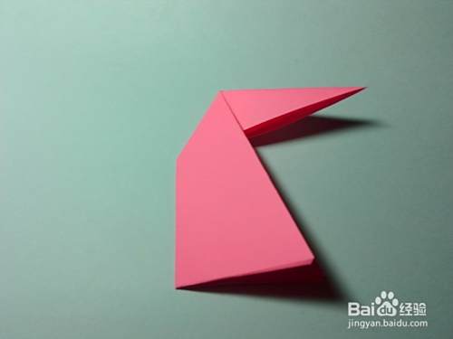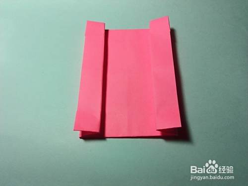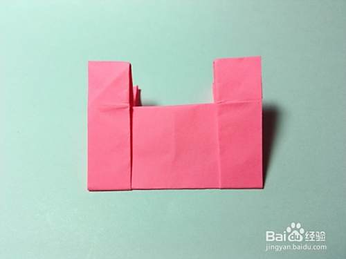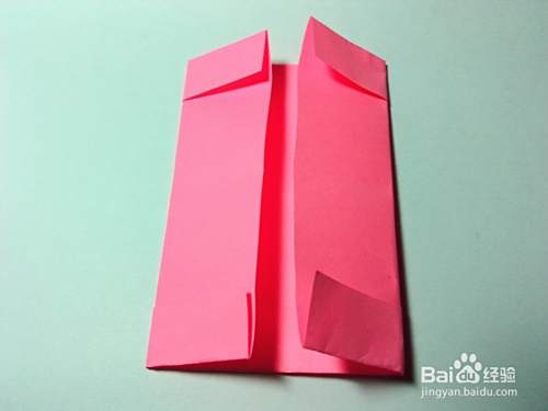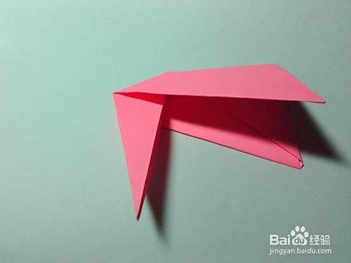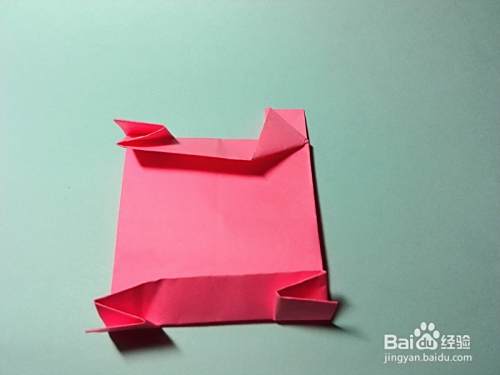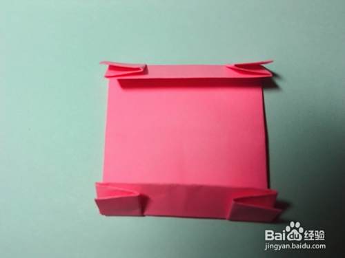 再翻面,将上下两边分别沿着上下端的折痕向内折,撑开右上内角,将角向上压折。