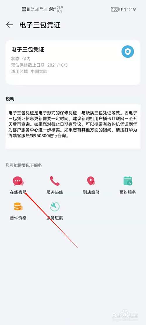 3、进入状态信息后,点击进入电子三包凭证,然后打开在线客服即可