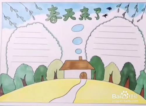 然后,在文字框的上面各画出四根树枝,再画出门前的小路,并用绿色马克笔写上主题词“春天来了”