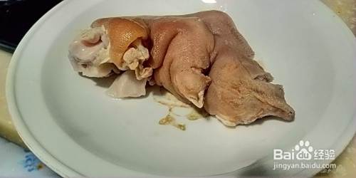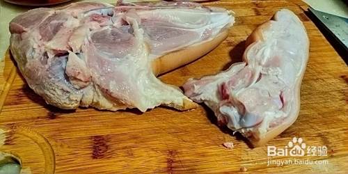 刨洗干净,从蹄膀关节处切下猪蹄。