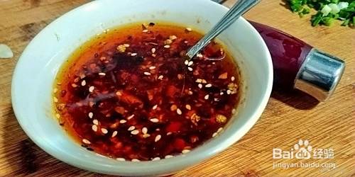 放凉拌酱油、醋、白糖、味精、芝麻油、花椒油、荣籽油、油辣子海椒调成汁,小葱切颗;