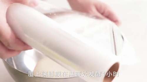 3将面团揉至光滑,覆上保鲜膜在温暖处发酵1小时,面团发酵至两倍大小。