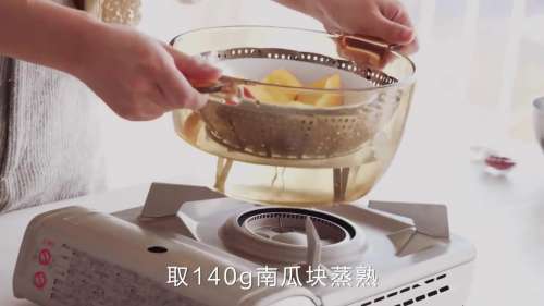 1取140g南瓜块蒸熟,去皮放入料理机打成泥,2g酵母加入120g温水静置2分钟融化。