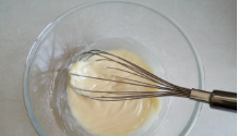 把流心酱装入裱花袋中备用,接着做蛋糕体,把玉米油加热到80度左右,倒入面粉中拌匀,加入牛奶和蛋黄拌匀,成细腻的蛋黄糊