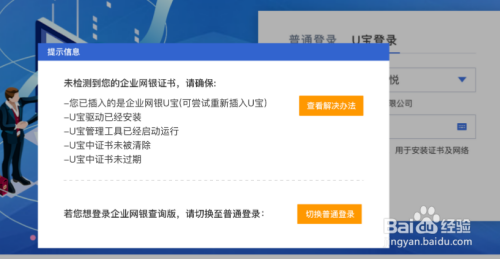 可能是因为控件与驱动安装异常或者U宝中证书已被注销。点击【查看解决办法】,进入登录帮助页。按照登录指南内容下载网银助手,使用网银助手进行检测和修复。如果U宝中没有证书,需要前往营业网点办理证书补发。