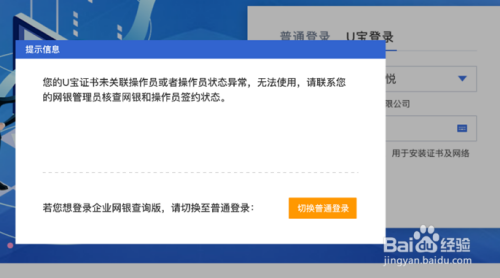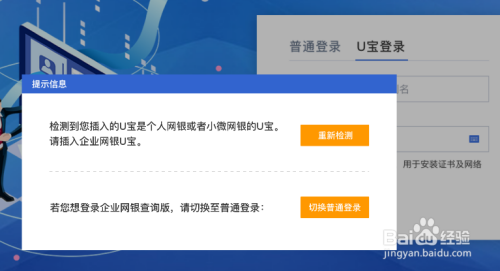 检查是否插入的是企业网银的U宝。若想办理个人或者小微业务,重新从官网进入“个人网上银行” 或“小微网上银行”登录入口。
