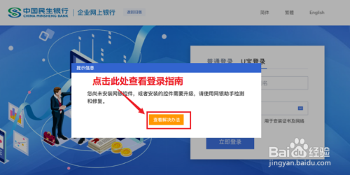 若控件报错内容,点击【查看解决办法】,进入登录指南页面,根据提示下载网银助手进行检测和安装。