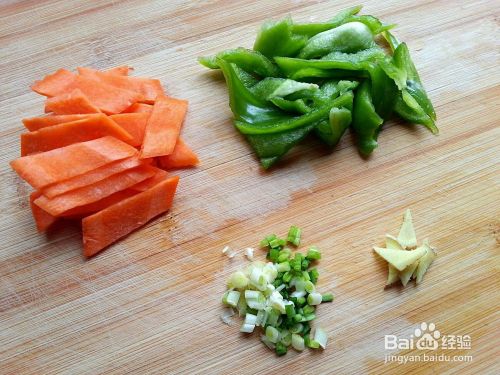 首先,我们先将青椒、胡萝卜、生姜洗净后,把青椒、胡萝卜切成丝,生姜切成小块