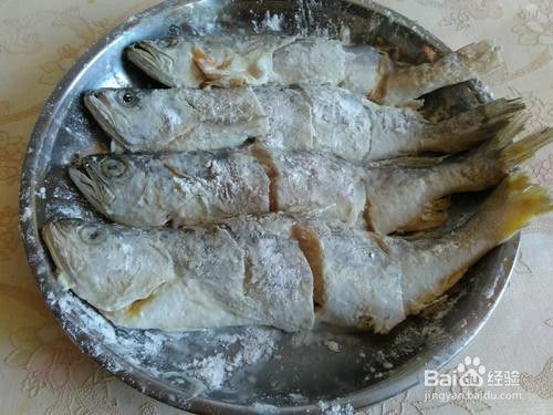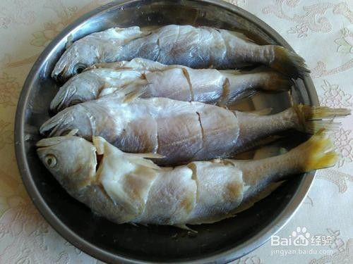 接着,我们把黄鱼洗净,在鱼背划上几刀