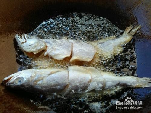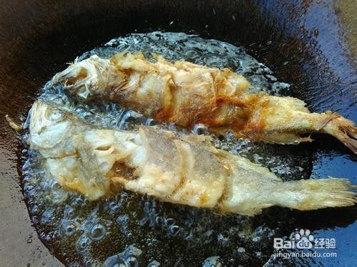 往锅里倒入适量的香油,大火把油烧开,把腌制好的黄鱼倒入锅里