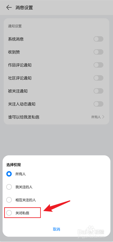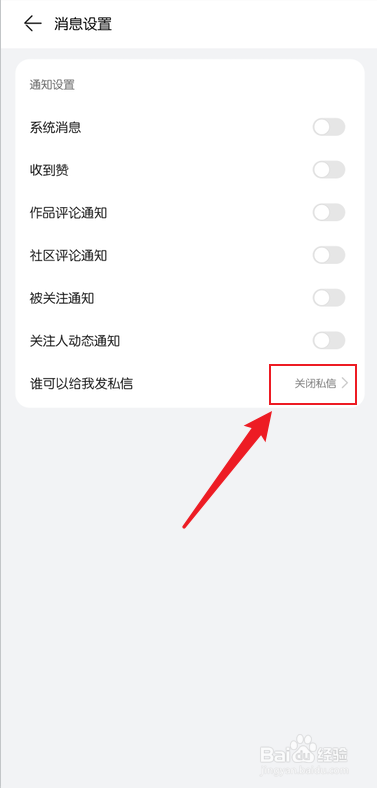 在消息设置中,点击【谁可以给我发私信】,如图所示: