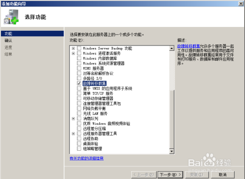 (2)在“选择功能”对话窗口,选择“故障转移群集”。然后点“下一步”。