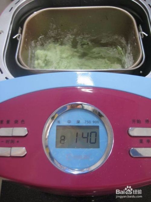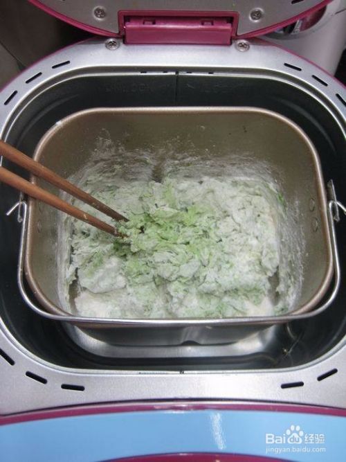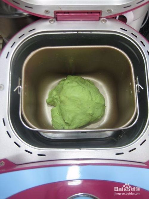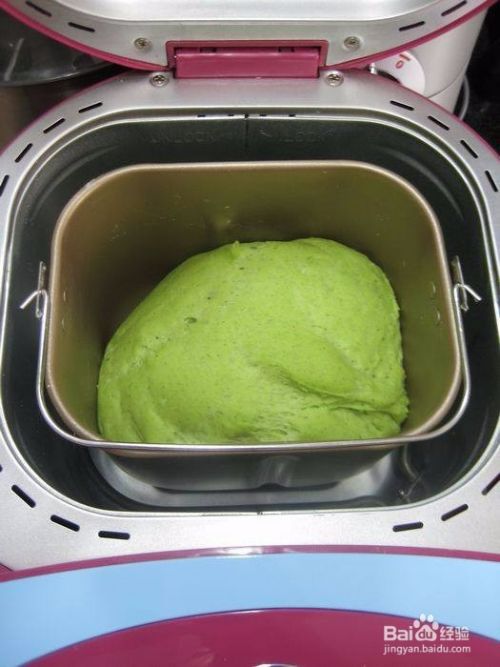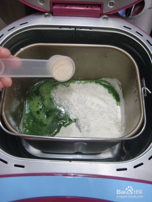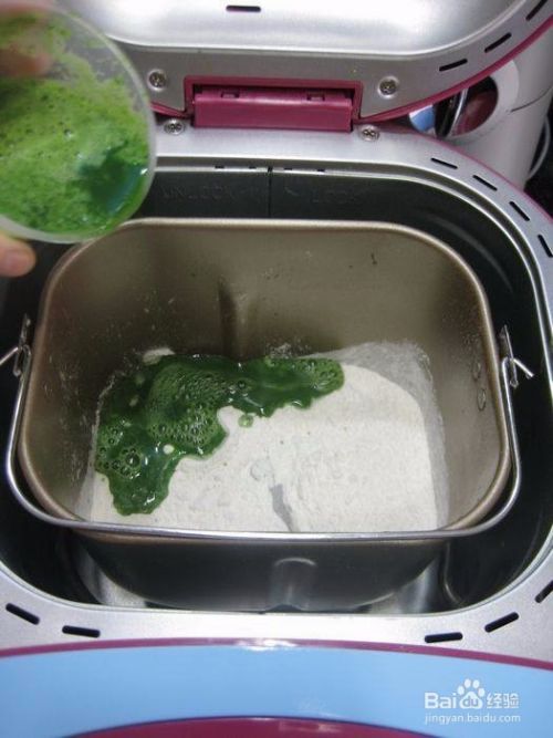 面粉放入面包机桶中,把菠菜汁搅一搅,取190克,倒入面粉中。
