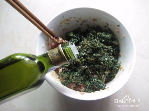 把野菜放入肉馅中,再倒入3大勺橄榄油把野菜拌一下,能让野菜更香一些