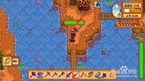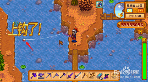 对准水面按左键进行抛竿,蓄力越大抛得越远。