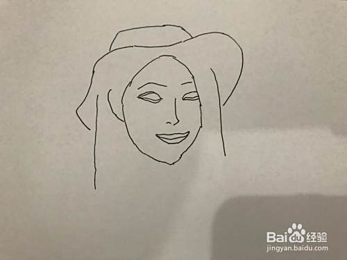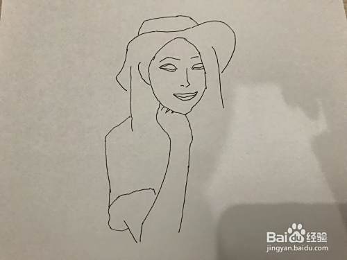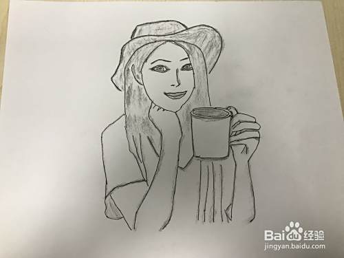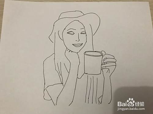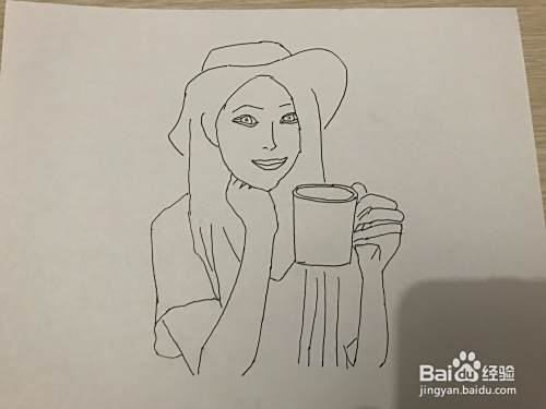 将模特部分涂黑使之立体,一个戴帽子、端杯子的模特初步画好了