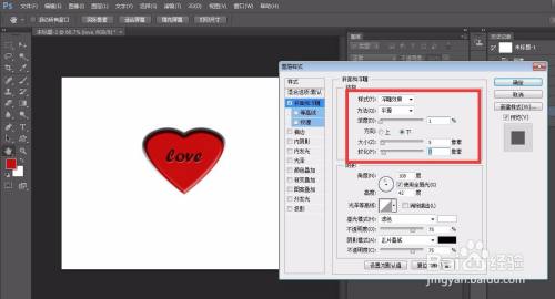 如下图所示,我们需要对文字也进行斜面浮雕参数设置,可以参考下图中小编的设置。这样,一个立体爱心就完成了。