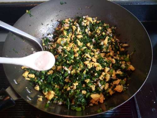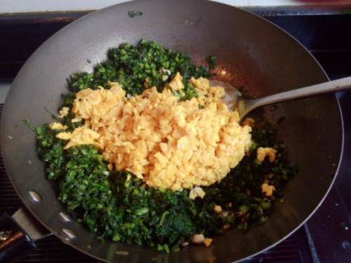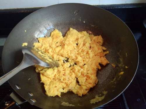5鸡蛋加些料酒打匀,放入热锅抄熟,铲碎,盛出。