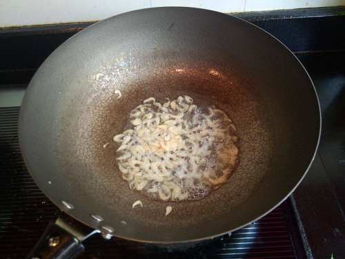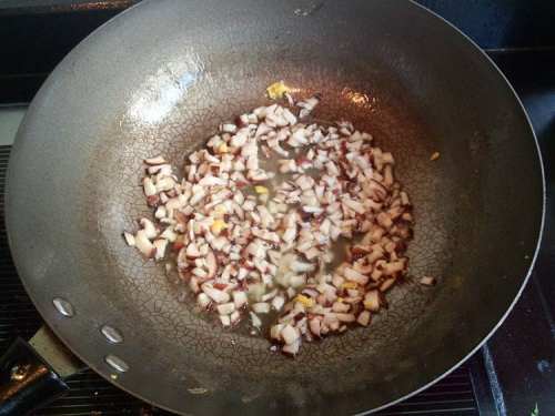 6锅里油热,放入洗净切碎的香菇,炒至发蔫,关火。