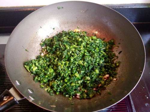 3把莴笋叶过冷水,切碎,挤去部分水分,待用。