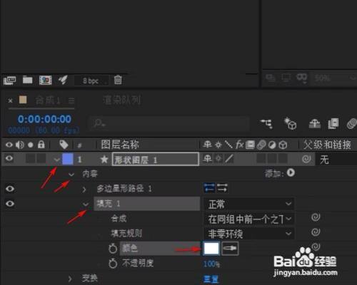 然后点击形状图层的倒三角,然后接着点击内容倒三角,然后点击填充倒三角,接着双击白色头指向的位置会出来一个直接选喜欢的颜色即可。