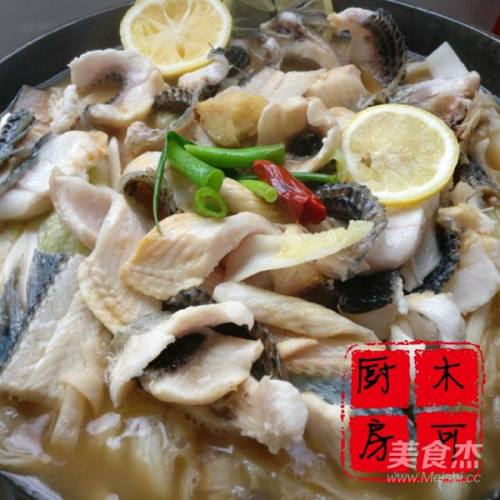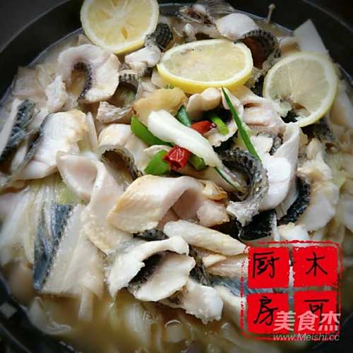 9煮出的汤可以用勺子来回的往鱼肉上浇(多浇几次),最后加入葱断、辣椒、柠檬装饰