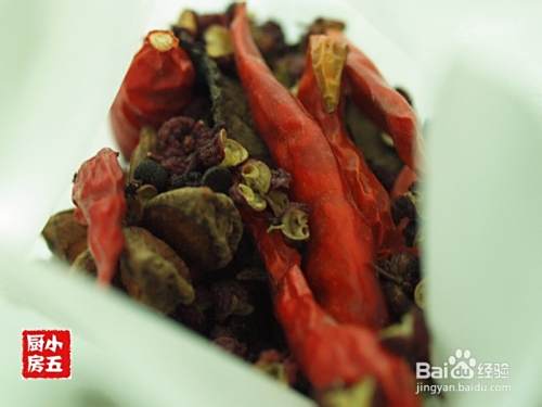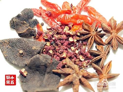 准备好各种香料:干辣椒、陈皮、八角与花椒。