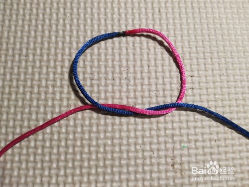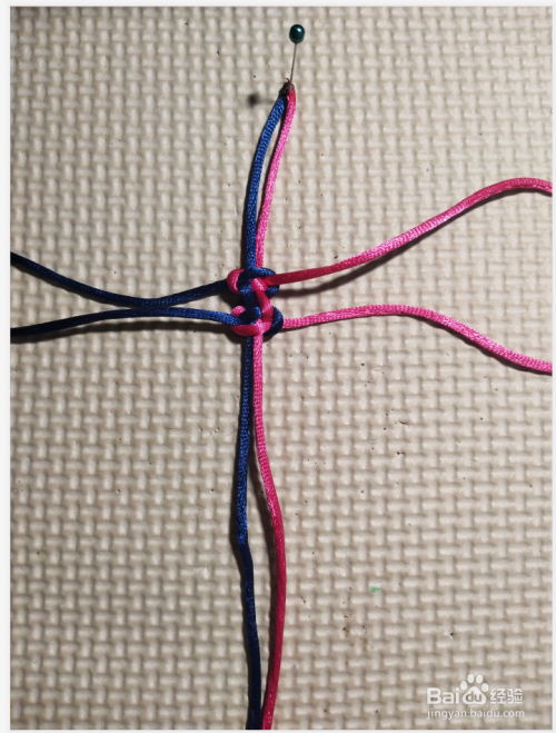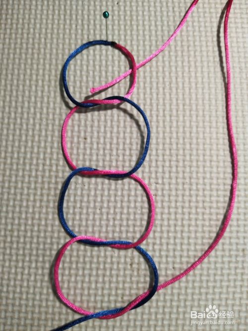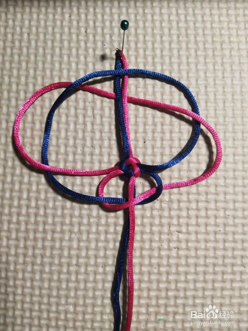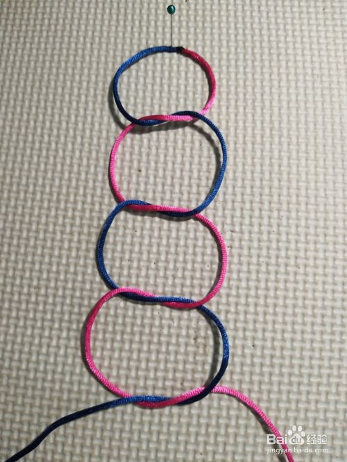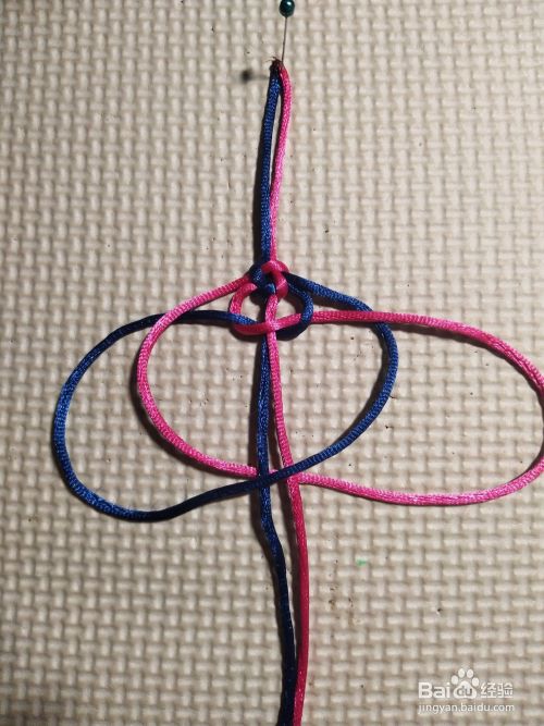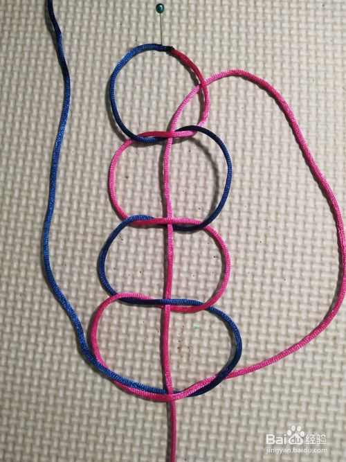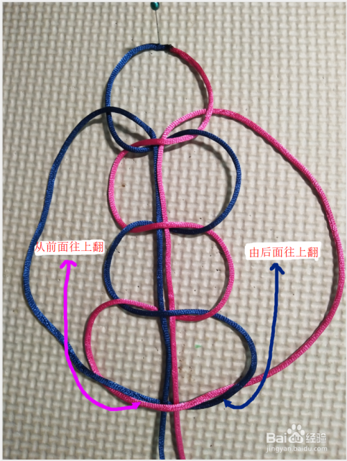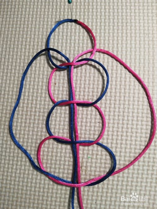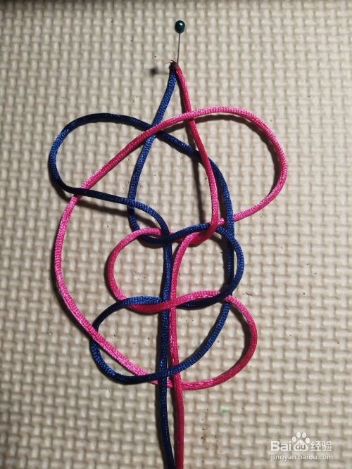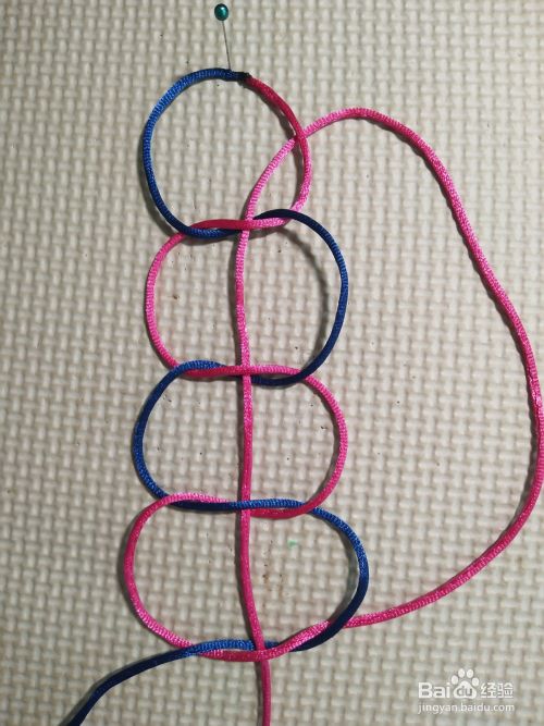 再将左边线往上,压第一个线圈,往下穿过四个结的中间。