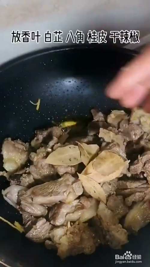 起锅烧油,倒入20g姜,爆香后放入羊肉,加入10g,香叶10g,白芷10g,八角10g桂皮,10g干辣椒
