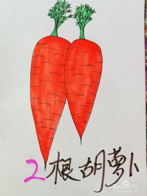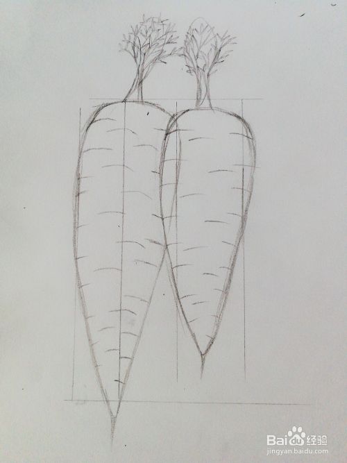 本经验主要讲述使用铅笔画出方形的定位框,再通过定位框可以画出胡萝卜的大致轮廓,然后慢慢的细画胡萝卜的纹路,接着上色,写上文字就可以了。