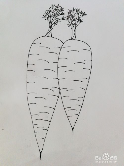 3、根据轮廓画出胡萝卜的纹路以及叶子的线条。