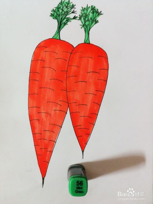 6、接着用56号绿色马克笔江胡萝卜的叶子进行上色。