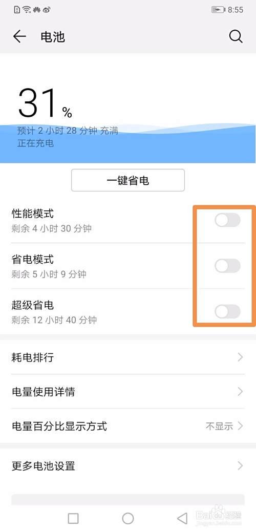 有几种电池设置,性能模式,省电模式,超级省电,性能模式不可省电可增加性能,其他两种模式可省电会减低通知降低性能等。