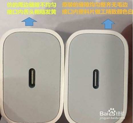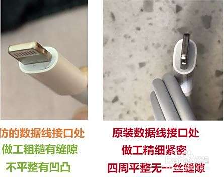 第六个方法:看数据线的接口也可以分辨。仿的数据线接口处做工粗糙有缝隙,原装的L接口这一面做工非常好,四周平整无一丝缝隙。