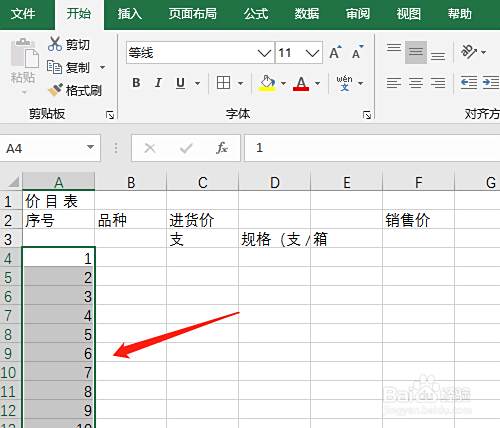 4. 顺序的数字编号输入一个后按Ctrl键拖动完成其他数字。在字母列标相交处拉大列宽。