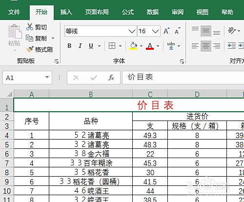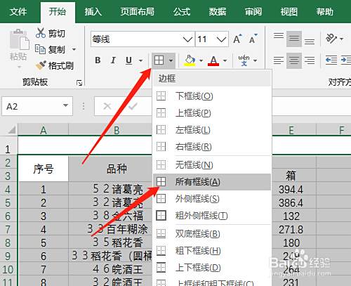 6. 加边框线操作,选定除标题外的其他资料,单击边框图标,下拉中单击所有框线。