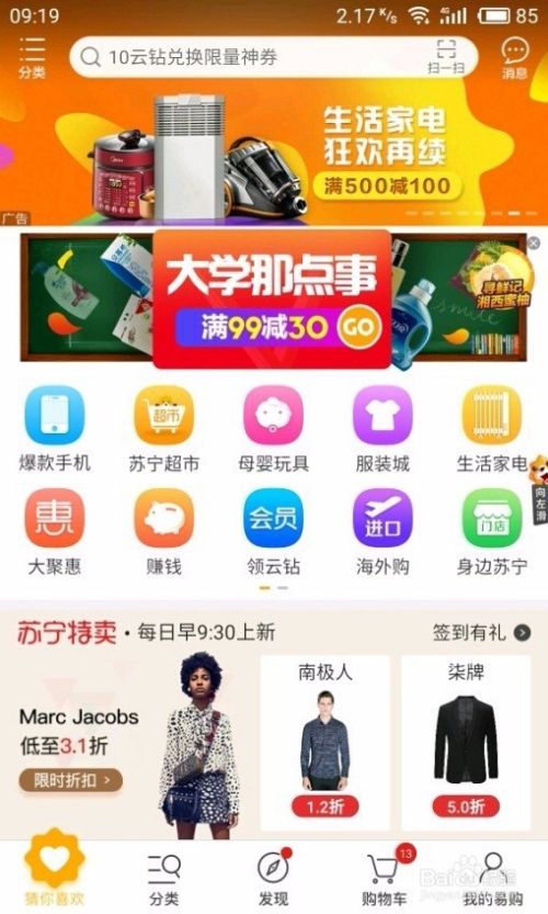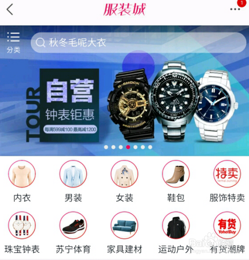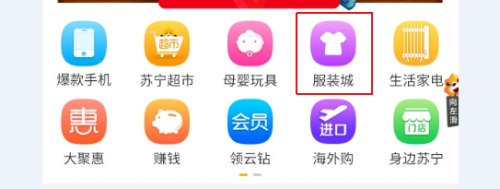 在顶部功能区位置即可找到苏宁服装城的入口,点击进去;