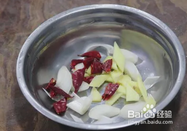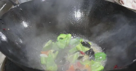 炒锅烧热,少许食用油,倒入葱姜红干椒爆香,再加入青红椒片翻炒几下淋入少许清水,加入料酒 白醋 食盐 鸡粉 胡椒面白糖搅拌化开。