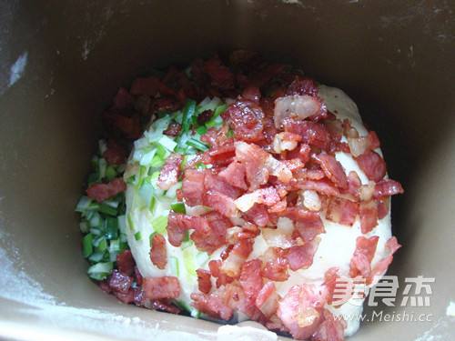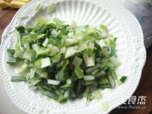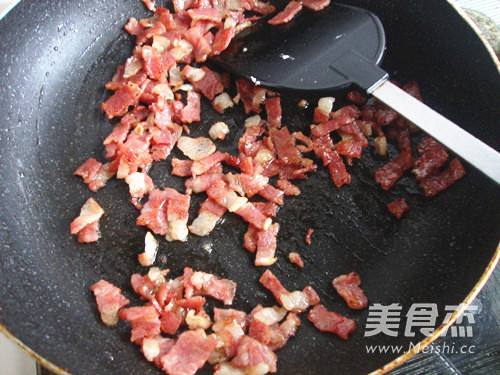 2培根切小片,锅里不放油,放入培根片煸出油了,晾凉待用