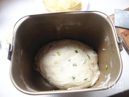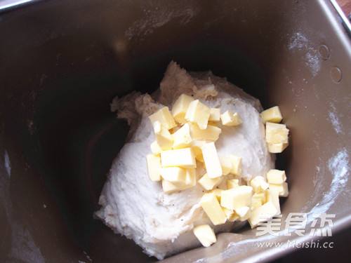 4土豆泥,面粉,牛奶,糖,盐,酵母,淡奶油全部放入面包桶,揉成团后加入室温软化的黄油,继续揉10分钟