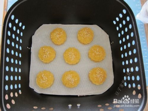 烤篮子里边铺上油纸,摆放上桃酥的面胚,在每一个面胚之间要留有一定的空隙,利于受热均匀。