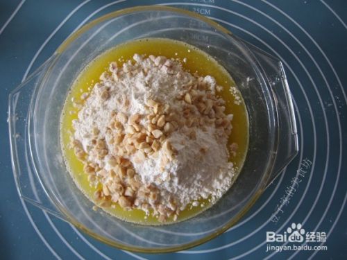 蛋糕粉倒进3图的油糖里边,花生碎也放进去,如果没有蛋糕粉,普通面粉也可以的。