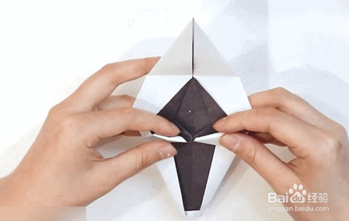 把上角向下折,再把上层展开,两侧向外折,两角折成小菱形。