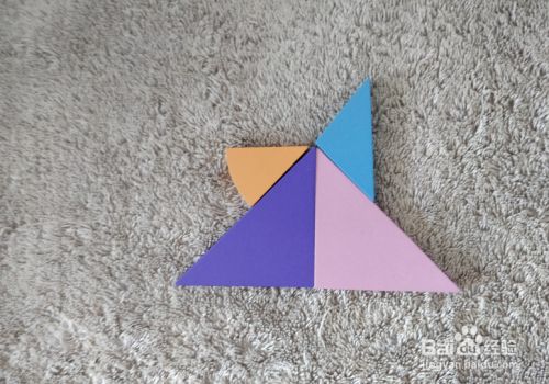 在三角形的下面,放上左右挨着的绿色、红色形状,如图。这样就拼好了。