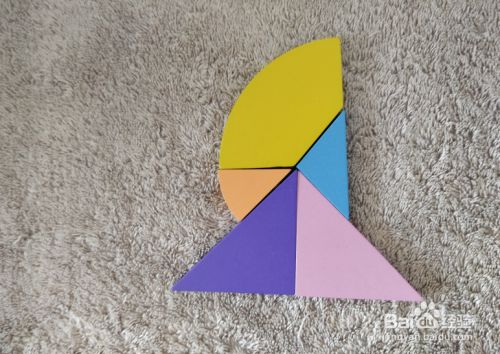 在小三角形右侧,放上上下挨着的小扇形、蓝色形状,如图。