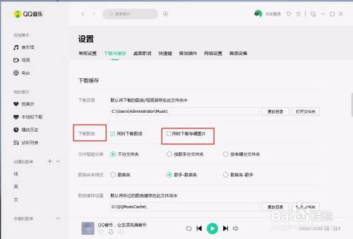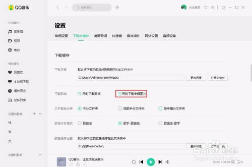 切换至下载与缓存设置后,在下载歌曲的设置中,找到“同时下载专辑图片”,点击勾选“同时下载专辑图片”,那么当下次下载歌曲的时候,QQ音乐就是同时下载专辑图片