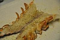 在把炒好的蘑菇酱料平铺在龙虾上,将烤箱调200度,龙虾放进去烤至5分钟。