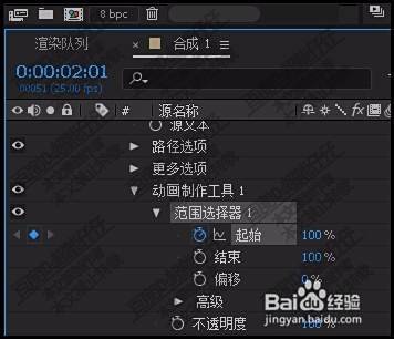 时间线指针在2秒的位置上,把起始参数设置为100;在这里K一帧。