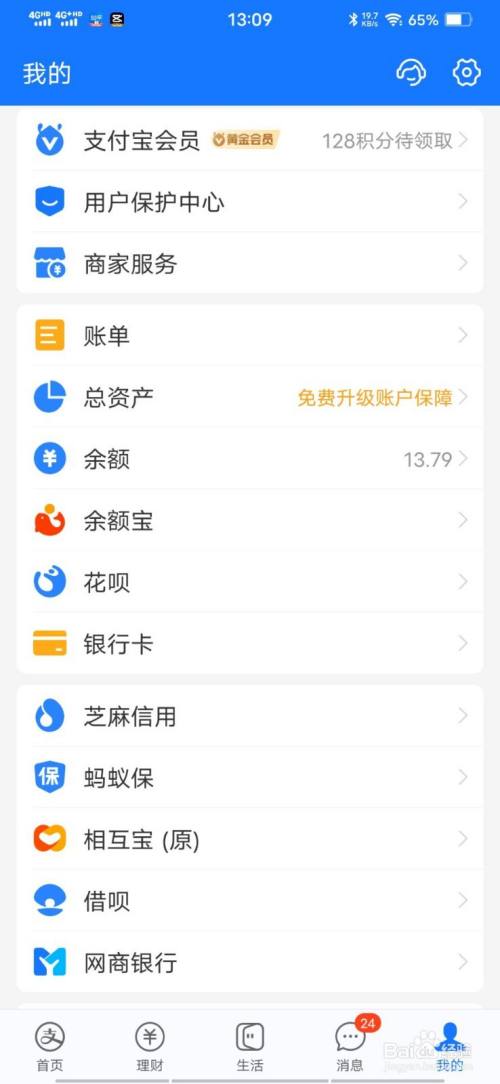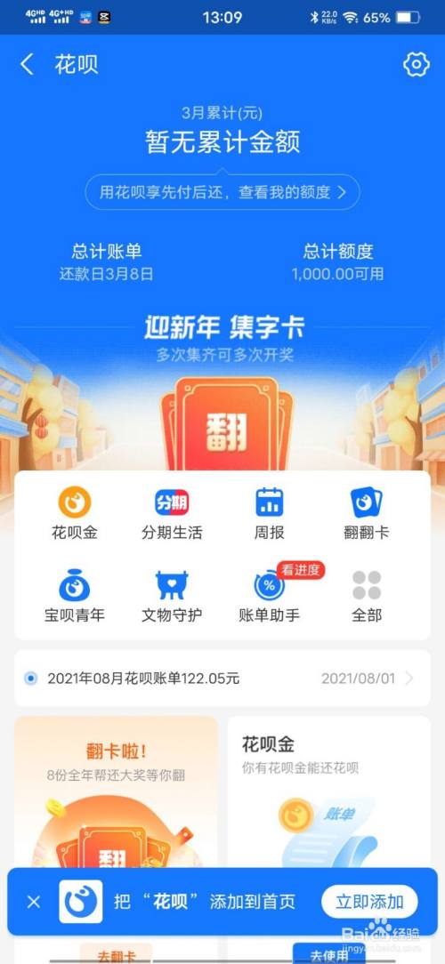 打开支付宝,点击下方的我的,再找到上方的花呗入口进入